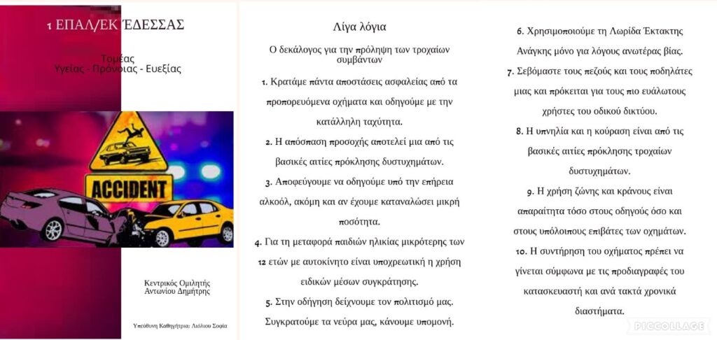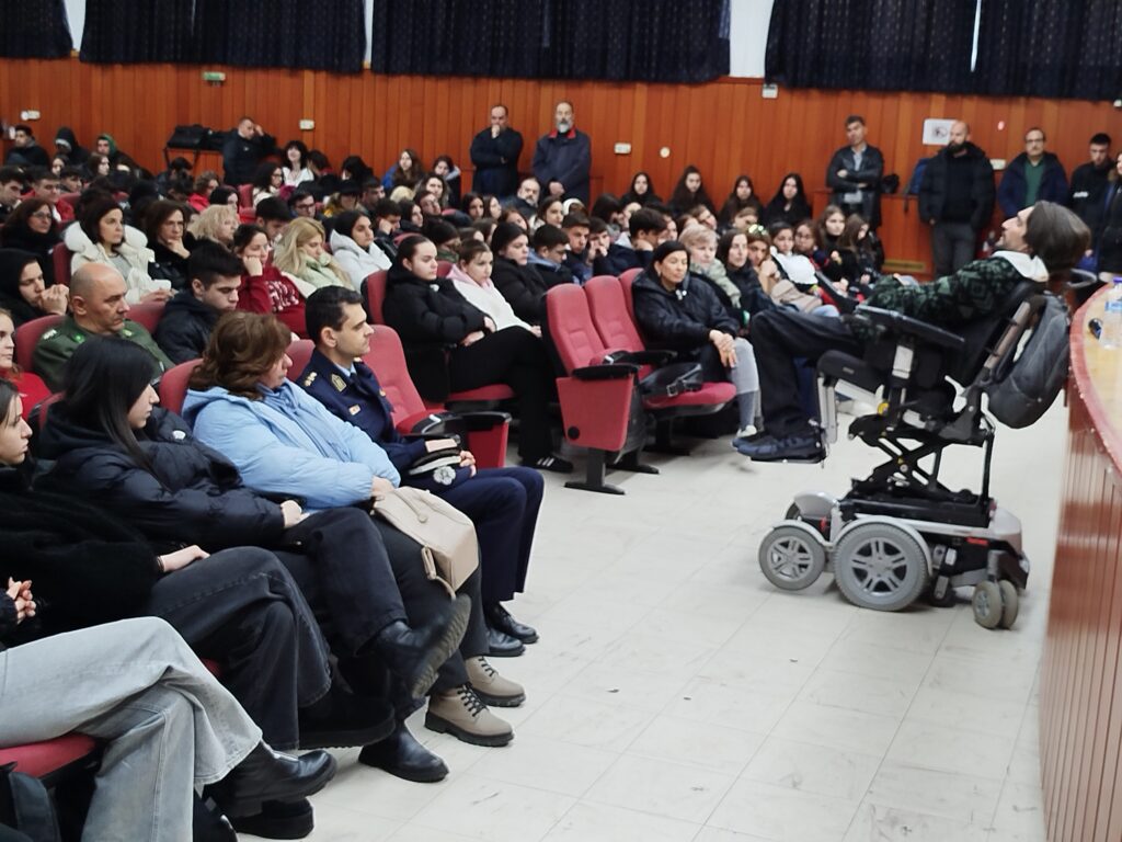 Ο κυρ. Αντωνίου Δημήτρης, θύμα τροχαίου και προασπιστής της ασφαλής οδήγησης και οδικής συμπεριφοράς, θέλησε μέσα από την ομιλία του και την προσωπική του εμπειρία να ευαισθητοποιήσει και να εμπνεύσει τους μαθητές μας και όλους όσους είχαν την χαρά να τον παρακολουθήσουν.